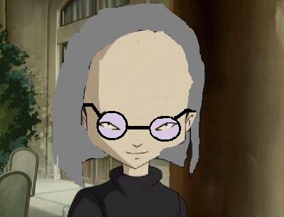 Le gros problème se situe au niveau des lunettes : elles sont complètement tordues ! Je sais que c'est difficile de dessiner au pinceau mais bon quande même ... |
