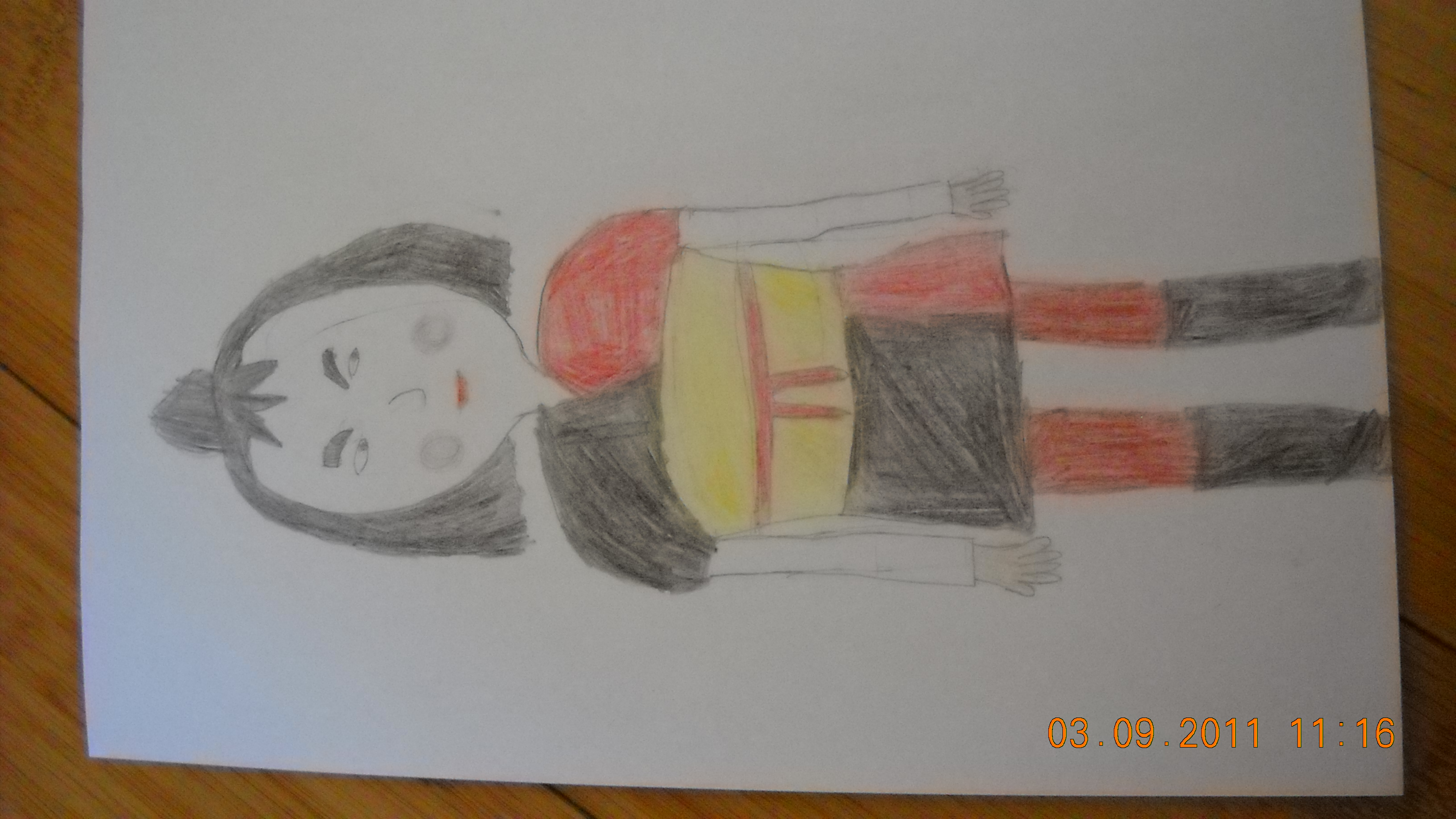 T'a un joli coup de crayon ! (jap) . Il faudrait un peu amélioré le visage, et les jambe sont un peu tyrop écartées. Mais bon c'est pas bien grave. C'est bien dessiné et bien soigné ! Tout mes encouagements !