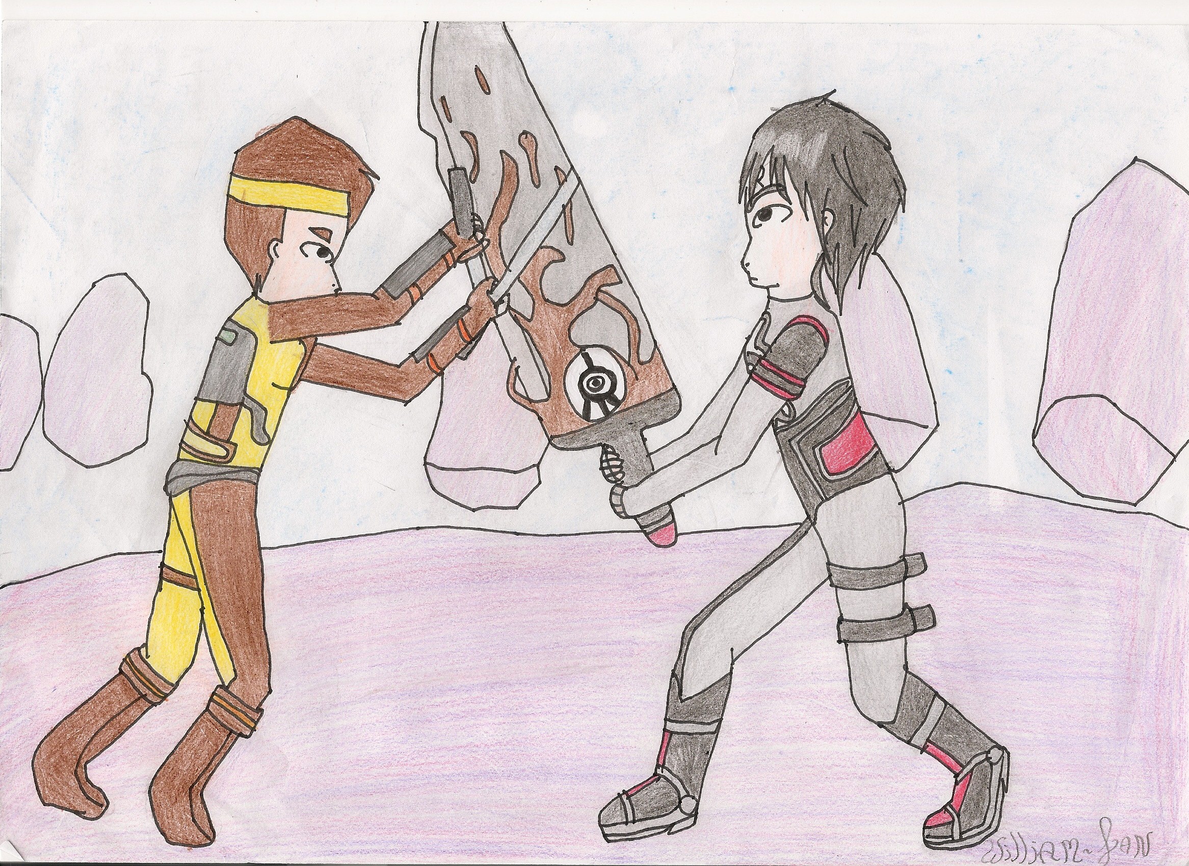 Voila un dessin de Ulrich sui se bat avec mon beau William sur le territoire des montagnes. Fait aux crayons de couleurs + pastels et feutres pour les contours, non décalqué. Commentez.