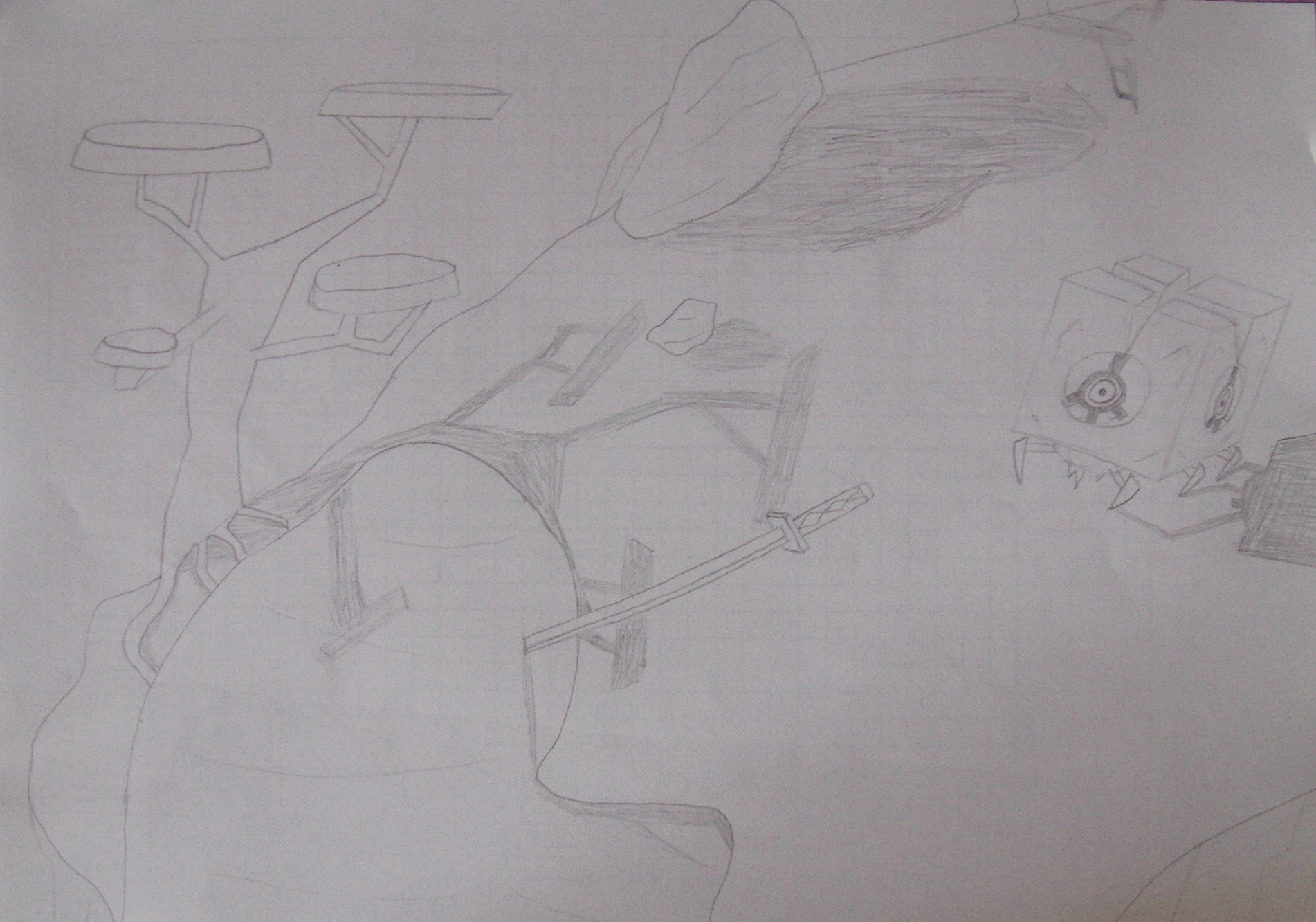 Pas mal ! Les ombres sont bien réussi, a aussi pour les ombres tu peux prendre un crayon plus gras (les crayons sont bien pour les contours). Mais sinon c'ets très bien réussi surtout que dessiné un monstre de dos ça doit pas être simple, moi je n'arive à dessiné que William de dos, sur Terre seulement :lol: :lol: :lol: :lol: :lol: :lol: :lol: :lol: :lol: |