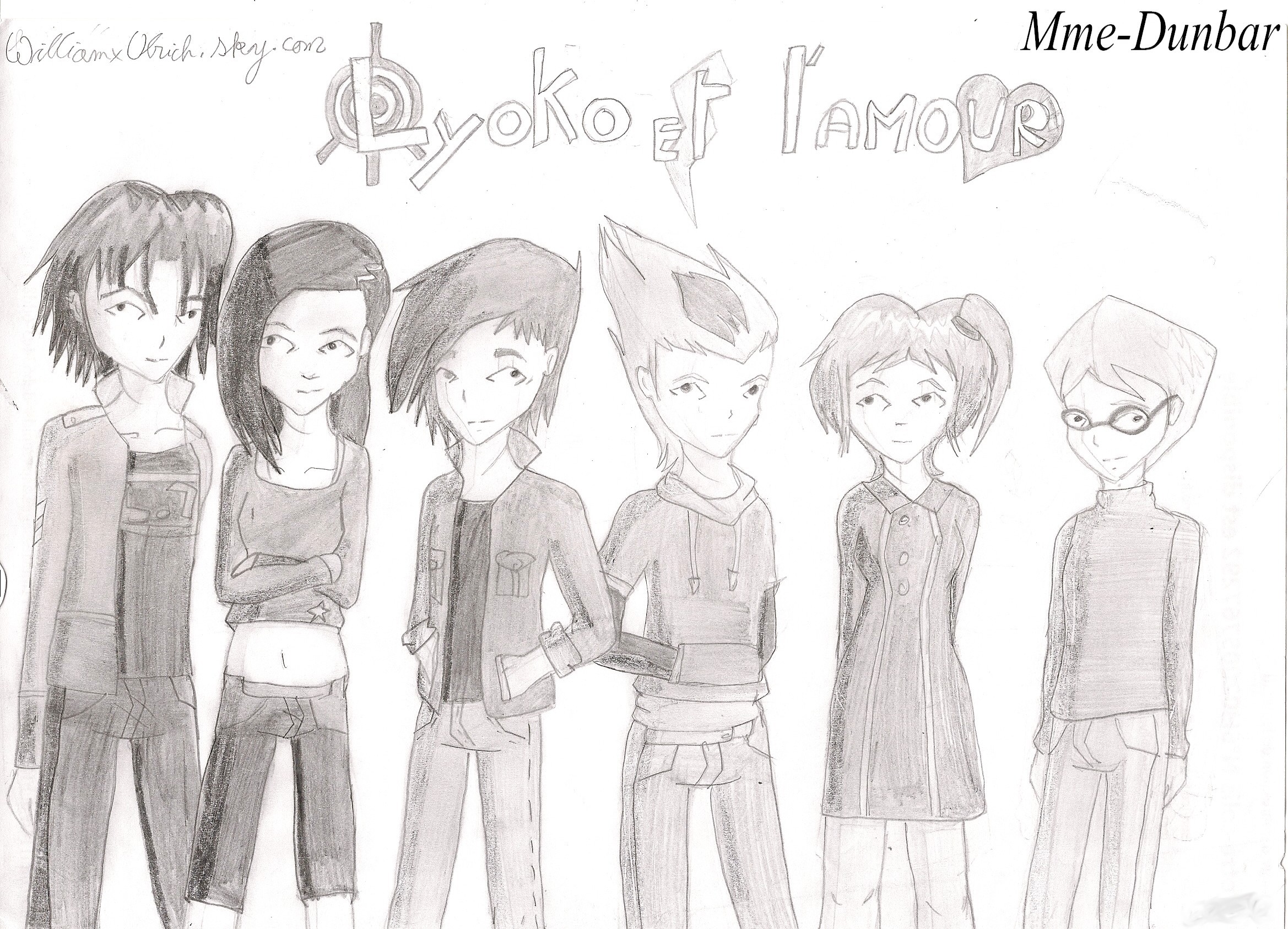 Couverture en N&B de ma fiction "Lyôko et l'amour" si vous êtes intéresser envoyé-moi à MP elle est sur mon skyblog secret (adresse notée sur le dessin) et mon ekalblog. J'ai allongé les cheveux de Odd, Yumi et Ulrich, William a des piercing à l'oreille et Aélita une petite mèche.