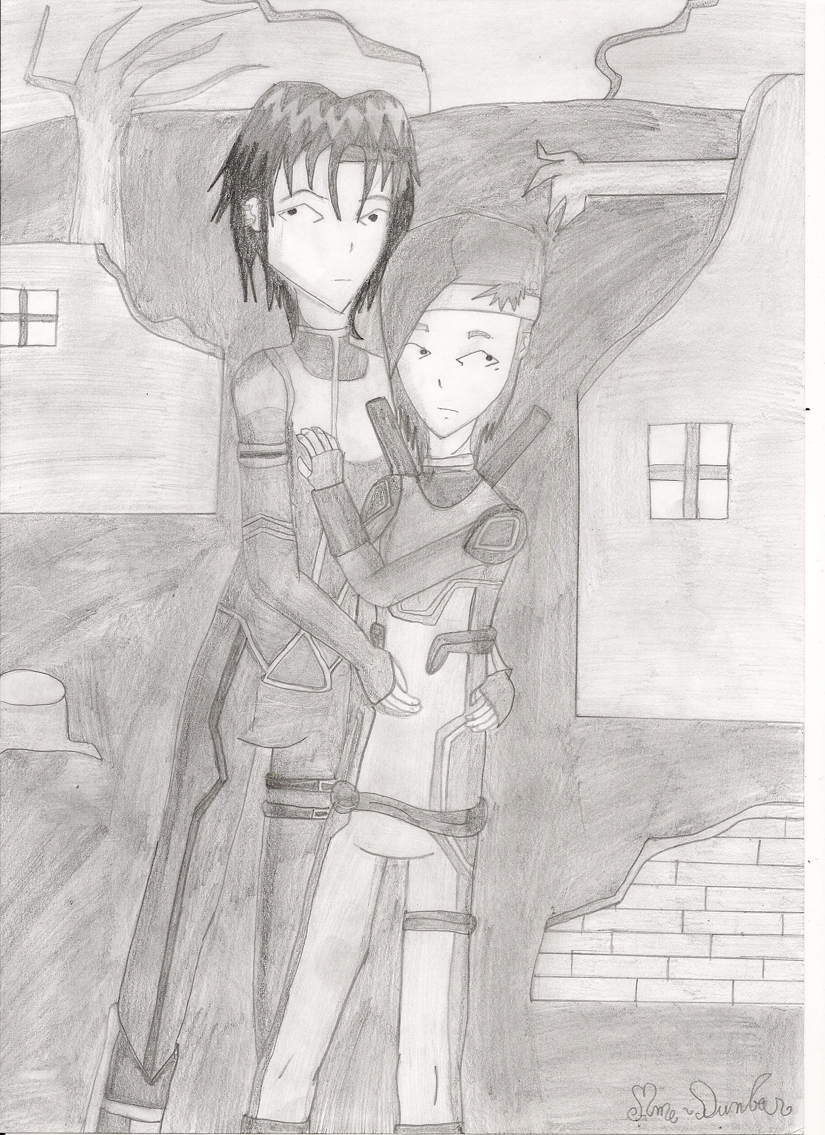 Voulant changer l'aspect de mes dessins, j'ai pris pour sujet le chaos, ce qui explique les habitations détruites et les arbres morts. Pour renforcer cet aspect j'ai dessiné des visages inquiets. Ce qui mène à un autre dessin de WxU, en noir et blanc cette fois.