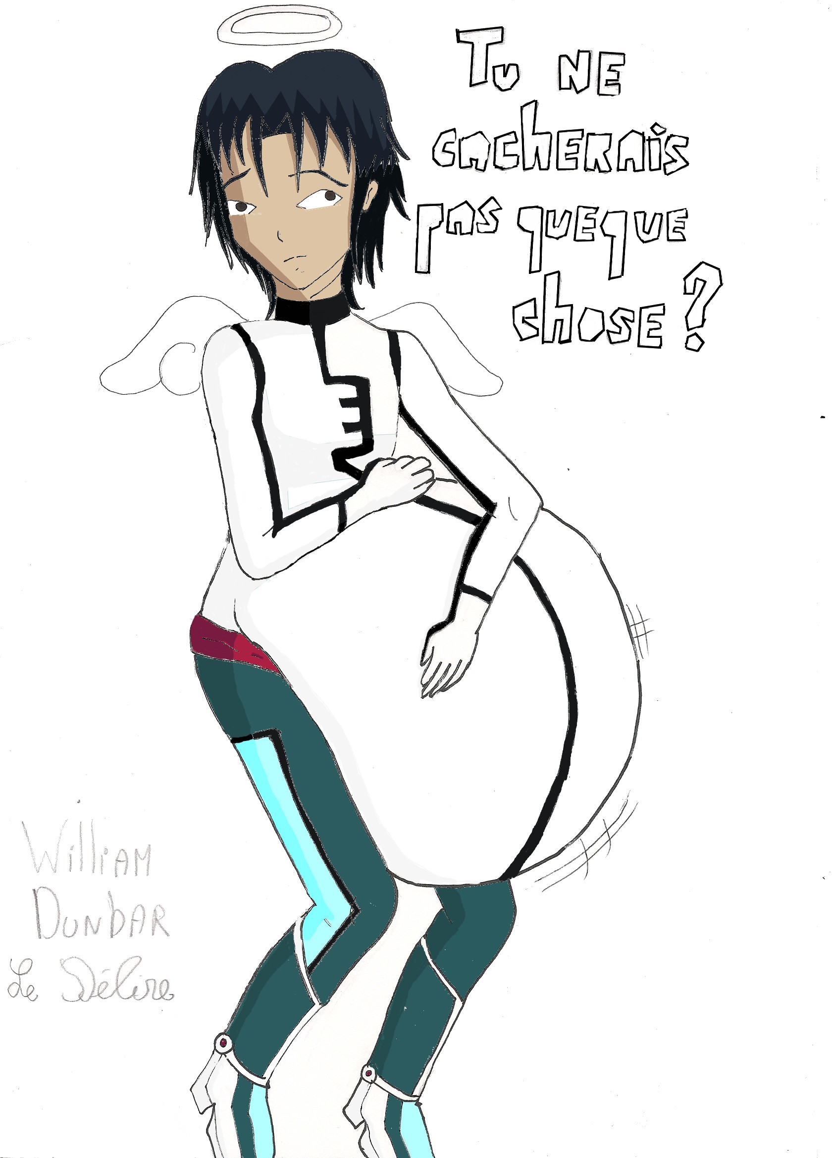 William semble se sentir coupable... Les traits d'ange sont connus pour symboliser une certaine "innocence". Je n'avais pas d'idée pour le décor donc j'ai laissé sur fond vide *o*. Je suis assez contente car j'ai réussi à faire des lignes de mouvement. Dessin à la main (gomme, crayon et marqueur) colorisation sous 'tofiltre.